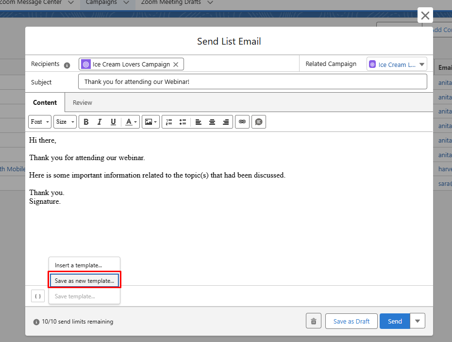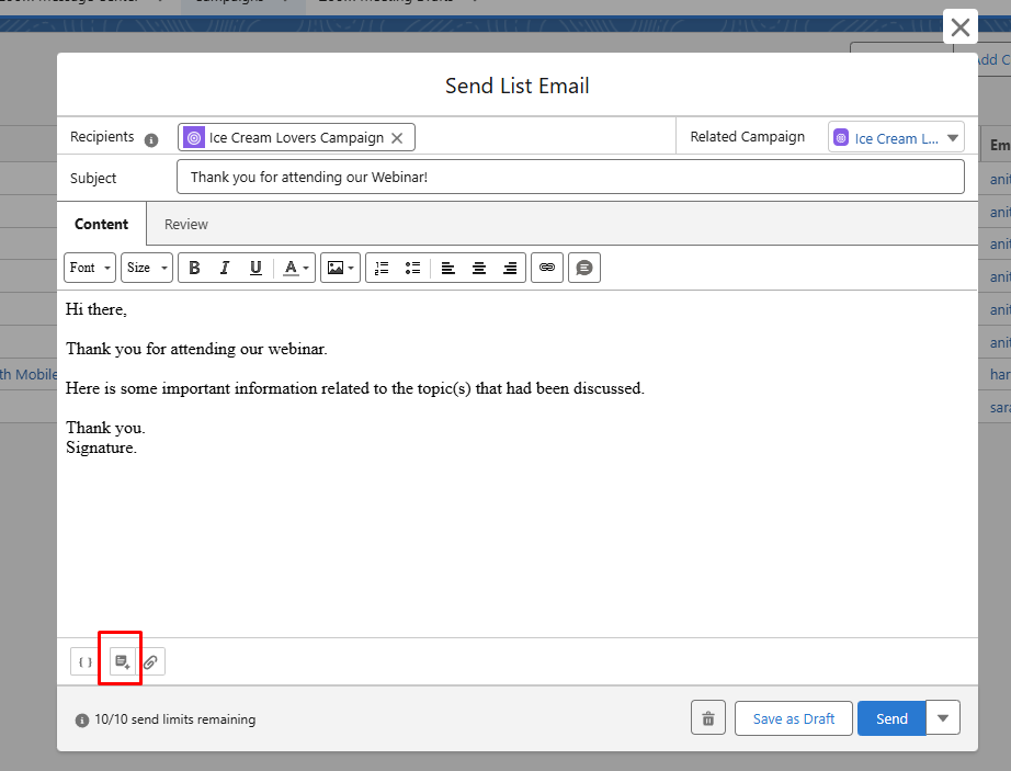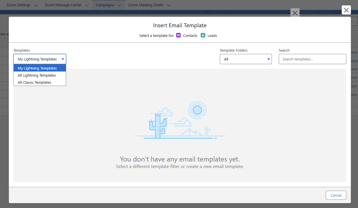 To create or use an email template from the Send Email option on ZFusion campaigns, click on the icon on the lower left of the email creation window: